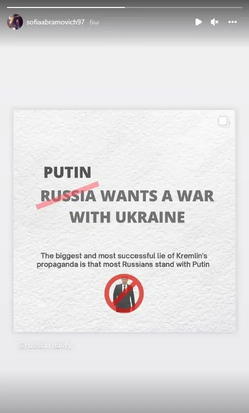 Επίσης η κόρη του Ρόμαν Αμπράμοβιτς, Σοφία, αντέδρασε έντονα μετά την εισβολή της Ρωσίας στην Ουκρανία. Η 27χρονη Σοφία Αμπράμοβιτς, που περνά μεγάλο μέρος της ζωής της στο Λονδίνο, ανέβασε φωτογραφία στο Instagram που δείχνει τον Ρώσο ηγέτη. Στη φωτογραφία έγραψε: «Το μεγαλύτερο και πιο επιτυχημένο ψέμα της προπαγάνδας του Κρεμλίνου είναι ότι οι περισσότεροι Ρώσοι στέκονται στο πλευρό του Πούτιν».