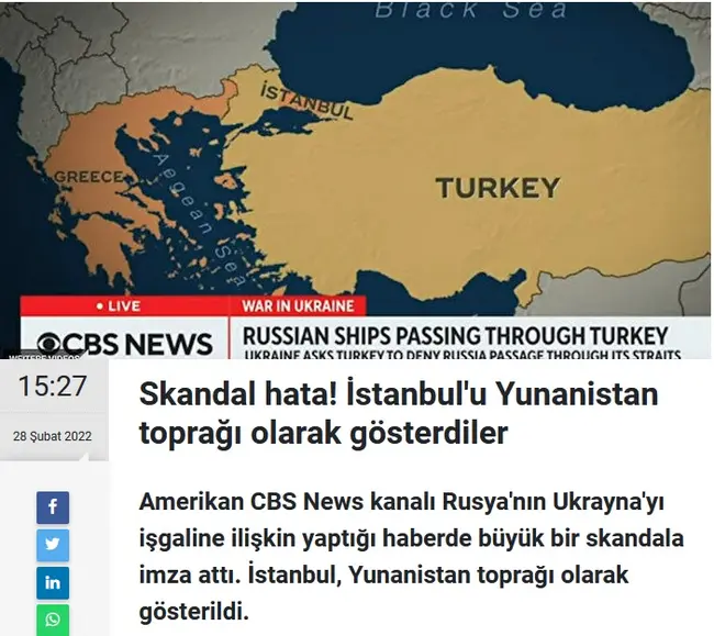 Μετά το αρχικό σοκ το διαδίκτυο πήρε φωτιά με τις ηλεκτρονικές εκδόσεις των τουρκικών Μέσων να παίρνουν τη σκυτάλη και να καταφέρονται κατά του αμερικανικού δικτύου. Η παγκόσμια απήχηση του CBS και η υψηλή τηλεθέαση του έκτακτου προγράμματος για την επίθεση στην Ουκρανία πυροδότησε κύμα αντίδρασης καθώς στο χάρτη που δείχνει τη διαδρομή διέλευσης των ρωσικών πλοίων, «παρουσίασε την Κωνσταντινούπολη στο κοινό του ως περιοχή της Ελλάδας».