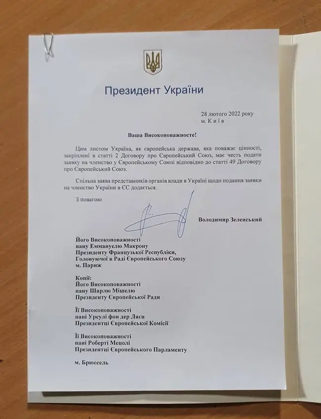 Λίγη ώρα νωρίτερα, μια φωτογραφία η οποία απεικονίζει τον Βολοντίμιρ Ζελένσκι να υπογράφει την αίτηση για ένταξη της Ουκρανίας στην Ευρωπαϊκή Ένωση διέρρευσε. Η συγκεκριμένη φωτογραφία δημοσιεύθηκε λογαριασμό του ουκρανικού κοινοβουλίου στο twitter, κάνοντας λόγο για μία ιστορική στιγμή. Η Ουκρανία δήλωσε ότι επιθυμεί κατάπαυση του πυρός και ρωσική απόσυρση, ενώ το Κρεμλίνο είπε ότι δεν θα ανακοινώσει τη θέση του. Οι διαπραγματευτές της Ρωσίας έχουν μιλήσει για την επίτευξη συμφωνίας που είναι προς το συμφέρον και των δύο πλευρών.