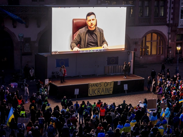 Το βιντεοσκοπημένο μήνυμα του Ουκρανού προέδρου προβλήθηκε σε αντιπολεμικές διαδηλώσεις μέσω γιγαντοοθονών που είχαν τοποθετηθεί σε πόλεις του κόσμου, όπως η Πολωνία, η Γεωργία, η Γερμανία, η Γαλλία και η Ουγγαρία.