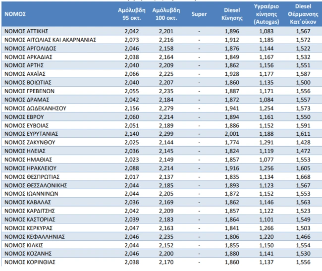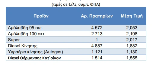 Σύμφωνα με τα στοιχεία που δίνει το Παρατηρητήριο των τιμών των υγρών καυσίμων στην Ελλάδα, η μέση τιμή της 95άρας αμόλυβδης στην Ελλάδα είναι 2,05 ευρώ το λίτρο, η 100άρα κοστίζει κατά μέσο όρο 2,19 ευρώ το λίτρο και το diesel κυμαίνεται στο 1,8 ευρώ το λίτρο. Το υγραέριο έχει ανέβει στο 1,13 ευρώ το λίτρο.