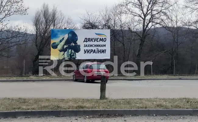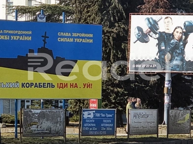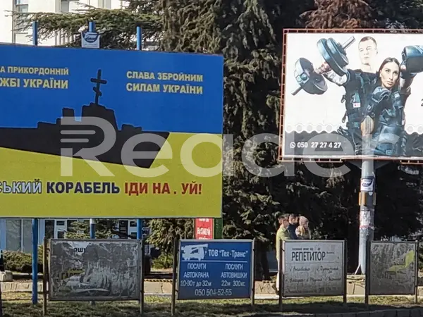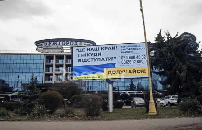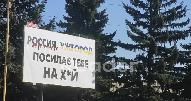 Την ίδια στιγμή, μια διαφημιστική πινακίδα είναι τοποθετημένη σε κεντρική περιοχή του Ούζχοροντ, στην οποία είναι τυπωμένο ένα μαύρο πολεμικό πλοίο, ακριβώς στη μέση της ουκρανικής σημαίας, με το μήνυμα: «Δόξα στη συνοριακή υπηρεσία της Ουκρανίας», «Δόξα στις Ουκρανικές Ένοπλες Δυνάμεις» και «Ρωσικό Ναυτικό, ήρθε η ώρα να φύγεις». Αυτό το μήνυμα είναι έτσι γραμμένο ώστε να μπορούν να το διαβάσουν τόσο οι Ρώσοι, όσο και οι Ουκρανοί για τους ίδιους ψυχολογικούς ευνόητους λόγους.