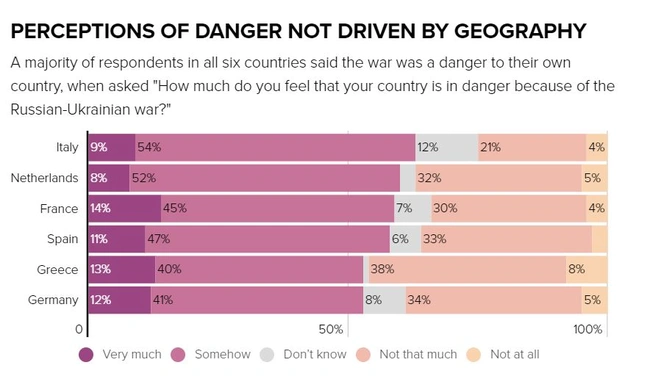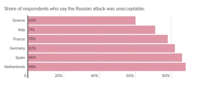 Το 60% των Ελλήνων θεωρεί «απαράδεκτη» την εισβολή των Ρωσικών δυνάμεων στην Ουκρανία, αλλά είναι το μικρότερο ποσοστό σε σύγκριση με τους πολίτες των υπόλοιπων ευρωπαϊκών χωρών που ερωτήθηκαν από το Politico. Για παράδειγμα, σχεδόν 9 στους 10 Γερμανούς θεωρούν απαράδεκτη την επίθεση, ενώ πάνω από 7 στους 10 Ιταλούς χαρακτηρίζει «απαράδεκτη» την επίθεση. Η μέτρηση διεξήχθη σε έξι χώρες (Ισπανία, Ιταλία, Γαλλία, Γερμανία, Ολλανδία και Ελλάδα) κι ενώ οι περισσότεροι Ελληνες ερωτηθέντες έδειξαν συμπάθεια για την Ουκρανία, το 34% είπε ότι η εισβολή ήταν είτε «αποδεκτή» ή «απαράδεκτη αλλά κατανοητή», ποσοστό μεγαλύτερο από κάθε άλλη χώρα. Σημειωτέον, η έρευνα πραγματοποιήθηκε στο διάστημα 9-11 Μαρτίου και σε αυτήν συμμετείχαν 1000 άτομα σε κάθε χώρα.