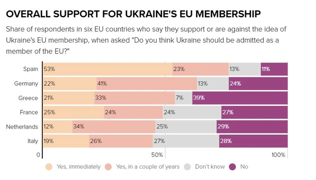 Γαλλία: Το 25% δηλώνει πως η Ουκρανία πρέπει να μπει αμέσως στην ΕΕ, το 24% εκφράζει θετική γνώμη για μια ένταξη σε βάθος μερικών χρόνων, το 24% απαντά πως δεν γνωρίζει και το 27% λέει «όχι».