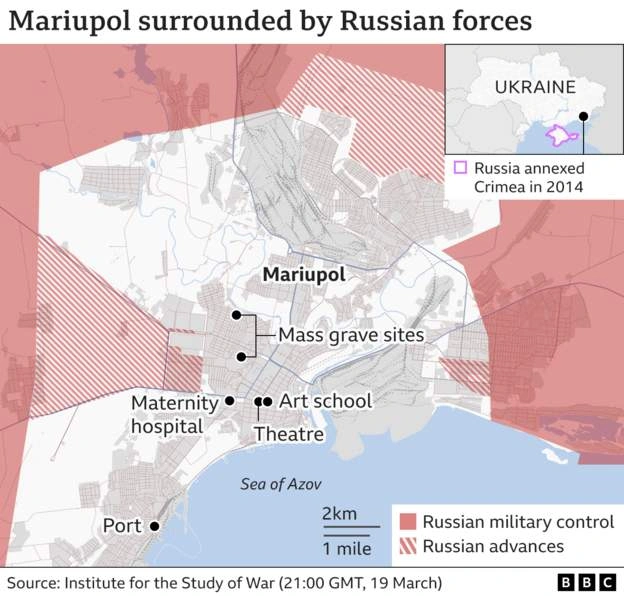 Τα ρωσικά Μέσα ενημέρωσης ισχυρίζονται ότι τα ουκρανικά στρατεύματα χρησιμοποιούν τους κατοίκους της Μαριούπολης ως «ανθρώπινες ασπίδες». Όμως η Ουκρανία λέει ότι οι δυνάμεις της αντιστέκονται στον αδιάκριτο ρωσικό βομβαρδισμό κατοικιών και δημόσιων κτιρίων. Εικόνες από δορυφόρους και drone δείχνουν μια κατεστραμμένη πόλη.