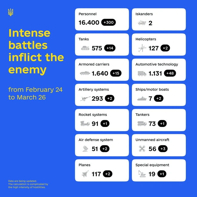 Η Ρωσία ανακοίνωσε ότι οι θάνατοι των Ρώσων στρατιωτών είναι 1.351, όμως, από το Κίεβο αναφέρουν πως άλλα 14 τανκς της Ρωσίας καταστράφηκαν, όπως και δύο ελικόπτερα, αλλά και δύο αεροπλάνα, ανάμεσα σε άλλα, όπως αναφέρει και το σχετικό γράφημα:
