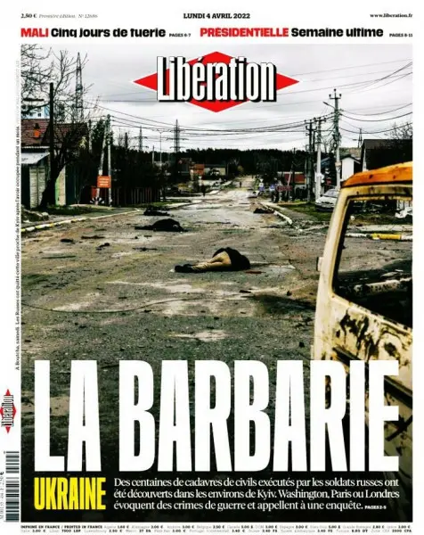 «Βαρβαρότητα» είναι η λέξη που έχει επιλέξει στο πρωτοσέλιδό της η γαλλική εφημερίδα Liberation σχολιάζοντας την πρωτοφανή αγριότητα που επιδεικνύουν οι ρωσικές δυνάμεις απέναντι στους Ουκρανούς αμάχους. Για την γερμανική εφημερίδα «MorgenPost», η σφαγή του Πούτιν είναι η φράση που περιγράφει τις θηριωδίες του ρωσικού στρατού στην ουκρανική.