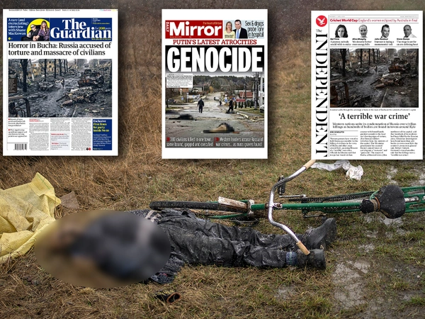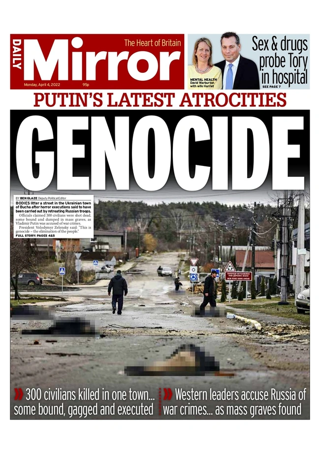 «Τρόμος στη Μπούκα: H Ρωσία κατηγορείται για βασανιστήρια και σφαγή αμάχων», είναι ο πρωτοσέλιδος τίτλος της βρετανικής εφημερίδας Guardian ενώ για την εφημερίδα «Independent» το καθεστώς Πούτιν διέπραξε ένα τρομερό έγκλημα πολέμου. Υπό τον τίτλο, «Γενοκτονία», η εφημερίδα «Τhe Mirror» αποτυπώνει τη φρίκη στη Μπούκα με το φακό να εστιάζει στις σορούς που είναι πεταμένες στους δρόμους της πόλης. Για την εφημερίδα «Metro», «oι θηριωδίες του Πούτιν στην Ουκρανία είναι χειρότερες και από αυτές της τρομοκρατικής οργάνωσης Ισλαμικό Κράτος».