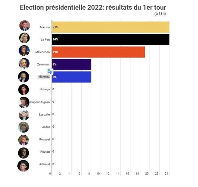 Σύμφωνα πάντα με την ίδια την βελγική εφημερίδα, η οποία υπογραμμίζει ότι πρόκειται απλώς για εκτιμήσεις σε έναν μικρό αριθμό ερωτηθέντων, ο υποψήφιος της Αριστεράς Ζαν Λικ Μελανσόν συγκεντρώνει το 19% των ψήφων που πρόκειται για μια πολύ καλή εκλογική επίδοση, ενώ από 8% συγκεντρώνουν η υποψήφια του Ρεπουμπλικανικού Κόμματος Βαλερί Πεκρές και ο ακροδεξιός υποψήφιος Ερίκ Ζεμούρ.