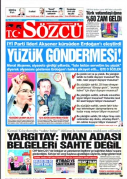 Η Μεράλ Ακσενέρ έβαλλε κατά του Ρετζέπ Ταγίπ Ερντογάν με αφορμή την κατάρρευση της τουρκικής οικονομίας κι αναφέρθηκε σε ένα συμβάν από το μακρινό παρελθόν, και συγκεκριμένα από το 1993 όταν ο Τούρκος πρόεδρος διεκδικούσε την δημαρχία της Κωνσταντινούπολης. Οι αιχμές της Ακσενέρ για το περίφημο πλέον στην Τουρκία δαχτυλίδι, κατέληξαν πρωτοσέλιδο στην εφημερίδα Sozcu. Ενα δαχτυλίδι, που το 1993 ο Ταγίπ Ερντογάν χαρακτήριζε ως τη «μοναδική του περιουσία», αξιοποίησε η αντιπολίτευση στην Τουρκία για να εξαπολύσει σφοδρή επίθεση στον Τούρκο πρόεδρο για τη φτώχεια του λαού και τη δική του, πολυτελή ζωή.