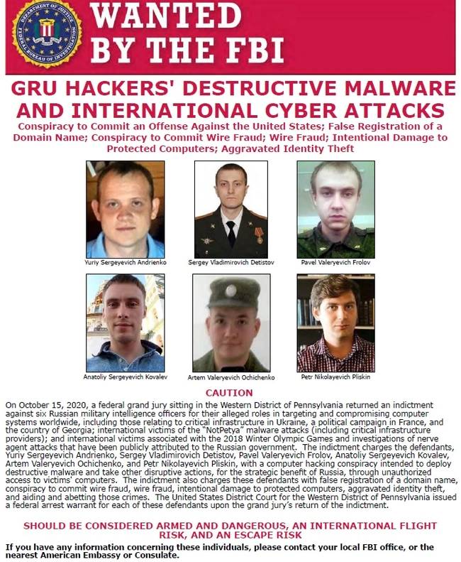 Ειδικότερα, οι αμερικανικές Αρχές έχουν βάλει στο μικροσκόπιο τους την εγκληματική δράση των Ρώσων χάκερ, οι οποίοι μέσω κακόβουλων διαδικτυακών δραστηριοτήτων έπληξαν κρίσιμες υποδομές των ΗΠΑ. Στους Γιούρι Αντριένκο, Σεργκέι Ντετίστοβ, Πάβλε Φλόροβ, Ανατόλι Κοβάλεβ, Αρτέμ Κοτσιτσένκο και Πέτρ Πλίσκιν καταλογίζεται ότι ως μέλη εγκληματικής οργάνωσης ανέπτυξαν καταστροφικό κακόβουλο λογισμικό προβαίνοντας σε παράνομες ενέργειες με στρατηγικό όφελος για τη Ρωσία. Και οι έξι στρατιωτικοί υπηρετούν στην πανίσχυρη μονάδα 74455 της GRU, στην οποία οι ερευνητές της κυβερνοασφάλειας της έχουν αποδώσει και τις ονομασίες Sandworm Team, Telebots, Voodoo Bear και Iron Viking.