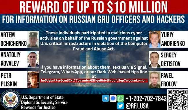 Τη στιγμή που οι αμερικανικο-ρωσικές σχέσεις είναι στο ναδίρ λόγω της εισβολής στην Ουκρανία και ο Ρώσος πρόεδρος Βλαντίμιρ Πούτιν απειλεί ευθέως την Ουάσινγκτον και τους συμμάχους της για τη στρατιωτική βοήθεια, που παρέχουν στο Κίεβο, το υπουργείο Εξωτερικών των ΗΠΑ επικήρυξε με το ποσό των 10 εκατ. δολαρίων έξι χάκερ των διαβόητων στρατιωτικών μυστικών υπηρεσιών της Μόσχας, η παράνομη δράση των οποίων στοίχισε στην αμερικανική οικονομία 1 δισ. δολάρια.