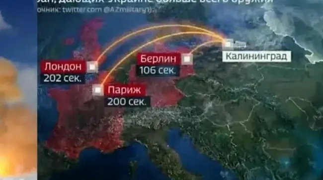 Παγκόσμια ανησυχία προκαλεί μία προσομοίωση πυρηνικής επίθεσης που παρουσίασε η ρωσική κρατική τηλεόραση, σύμφωνα με την οποία το Λονδίνο, το Παρίσι και το Βερολίνο θα μπορούσαν να πληγούν μέσα σε 200 δευτερόλεπτα από την εκτόξευση πυρηνικών πυραύλων. Για την ακρίβεια οι πύραυλοι θα μπορούσαν να φτάσουν από το Καλίνινγκραντ -το ρωσικό θύλακα μεταξύ Πολωνίας, Λιθουανίας και Βαλτικής Θάλασσας- στο Βερολίνο μέσα σε 106 δευτερόλεπτα, στο Παρίσι σε 200 δευτερόλεπτα και στο Λονδίνο σε 202 δευτερόλεπτα.