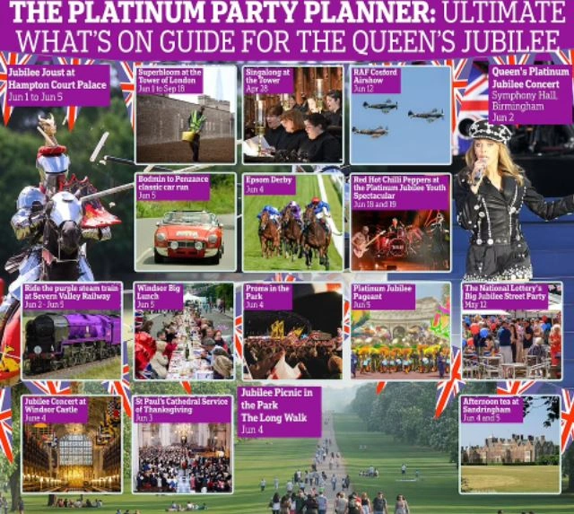 Επίσης οι εορταστικές εκδηλώσεις θα περιλαμβάνουν από την εμφάνιση της ομάδας Red Arrows (είναι ένα ακροβατικό αεροπορικό σμήνος της Βασιλικής Βρετανικής αεροπορίας - RAF που δημιουργήθηκε το 1964) μέχρι την συναυλία στο Παλάτι με τον Sir Elton John και πολλούς άλλους αστέρες της παγκόσμιας μουσικής σκηνής. Όπως αποκαλύπτει η Daily Mail, εκτός του Elton John στο φαντασμαγορικό πάρτι που θα μεταδοθεί ζωντανά από το BBC θα συμμετάσχουν ακόμα οι: Ed Sheeran, Stevie Wonder. Ακόμα δεν έχουν δοθεί στη δημοσιότητα άλλα ονόματα.