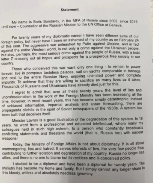 Ο σύμβουλος της μόνιμης ρωσικής αντιπροσωπείας στον ΟΗΕ στη Γενεύη, Μπορίς Μπόνταρεφ, υπέβαλε την παραίτηση του καθώς τάχθηκε κατά του πολέμου στην Ουκρανία. Την απόφαση του κοινοποίησε στη σελίδα του στο Facebook στην οποία έγραψε: «Στα είκοσι χρόνια της διπλωματικής μου καριέρας, είδα διάφορες στροφές στη δική μας εξωτερική πολιτική, αλλά ποτέ δεν ένιωσα τέτοια ντροπή για τη χώρα μου, όσο τη 24η Φεβρουαρίου αυτού του έτους».