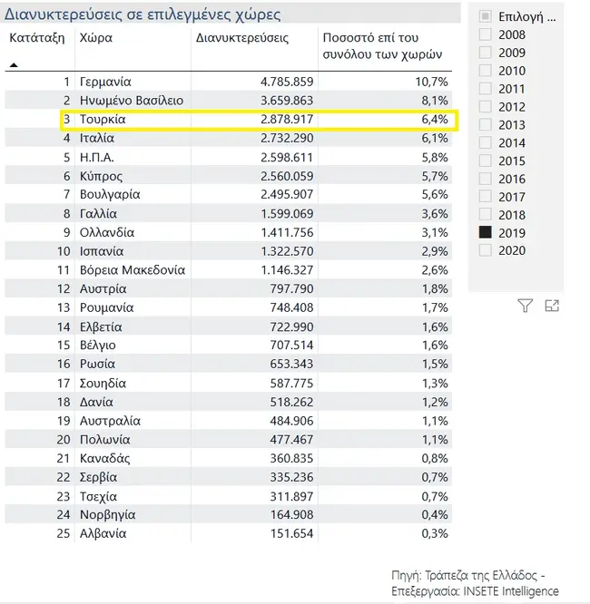 Βέβαια, η ανθελληνική προπαγάνδα των Τούρκων για τα νησιά του Αιγαίου δε φαίνεται να λαμβάνει υπόψη της το έντονο τουριστικό ρεύμα από τη χώρα μας προς την Τουρκία, η οποία αποτελεί τον τρίτο δημοφιλέστερο προορισμό για τους Ελληνες. Το 2019 ο αριθμός των Ελλήνων, οι οποίοι επισκέφτηκαν τη γείτονα ανήλθε σε 1.091.462, νούμερο, που αντιστοιχεί στο 13,2% των συνολικών αναχωρήσεων από τη χώρα μας για το εξωτερικό. Οσον αφορά στις διανυκτερεύσεις σε τουρκικά καταλύματα, έφτασαν τα 2.878.917 με πολύτιμο τουριστικό συνάλλαγμα Ελλήνων να ενισχύει την τουρκική οικονομία. Σε κάθε περίπτωση πάντως, το γεγονός ότι το καθεστώς Ερντογάν δε διστάζει να αναμείξει και τον τουρισμό στους ανθελληνικούς σχεδιασμούς του, τομέας, που ήταν σχεδόν στο απυρόβλητο όλα αυτά τα χρόνια καθώς αποτελεί πυλώνα των εθνικών οικονομιών και των δύο χωρών, συνιστά μία ακόμα εθνική απειλή αποκαλύπτοντας το εύρος της τουρκικής επιθετικότητας.