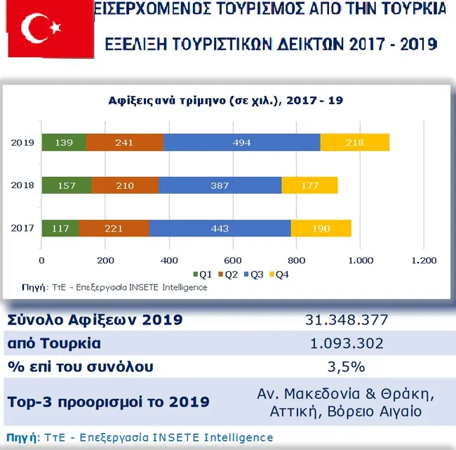 Σύμφωνα με τα επίσημα στατικά στοιχεία της Τράπεζας της Ελλάδος, ο εισερχόμενος τουρισμός από την Τουρκία κατέγραψε την περίοδο 2017-2019 αύξηση κατά 12,5% με το μερίδιο της τουρκικής αγοράς στον εισερχόμενο τουρισμό για το 2019, όταν σημειώθηκαν συνολικές εισπράξεις-ρεκόρ, ύψους 17,7 δισ. ευρώ, ανήλθε σε 3,5%. Ειδικότερα, οι αφίξεις από την Τουρκία δεν εμφανίζουν, σε σύγκριση με τις υπόλοιπες αγορές, τόσο έντονη εποχικότητα, καταγράφοντας την τουριστική περίοδο μόλις το 67,3% των αφίξεων. Δημοφιλέστεροι ελληνικοί προορισμοί για τους Τούρκους είναι η Ανατολική Μακεδονία και Θράκη, η Αττική και το Βόρειο Αιγαίο. Αναφορικά με τις διανυκτερεύσεις των τουριστών από την Τουρκία, το 2019 έφτασαν τα 4.066.000 (+25,0% σε σύγκριση με το 2017) με την πλειοψηφία τους, όπως είναι φυσικό, να καταγράφεται κατά τους καλοκαιρινούς μήνες.