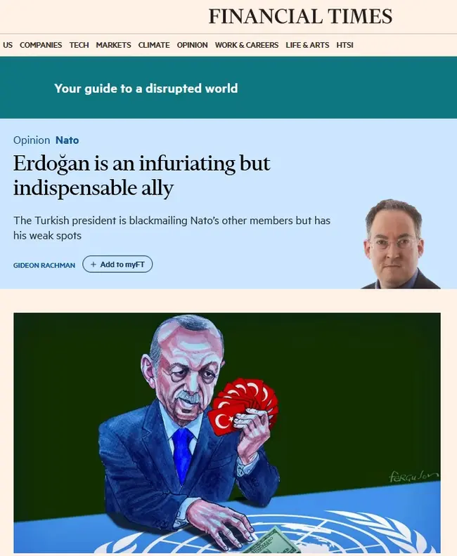 Στο άρθρο των Financial Times με τον τίτλο, «Ο Ερντογάν είναι ένας εξοργιστικός αλλά απαραίτητος σύμμαχος», αναπτύσσεται ο εξελισσόμενος εκβιασμός του Ρετζέπ Ταγίπ Ερντογάν με αφορμή την ένταξη των σκανδιναβικών χωρών στο ΝΑΤΟ με τον Βρετανό αρθρογράφο να χαρακτηρίζει ως «στρατηγική καταστροφή» την υπόθεση εργασίας για την αποβολή της Τουρκίας από τη Συμμαχία. Μάλιστα, εντοπίζονται από τον ίδιο τα «αδύνατα σημεία» του Τούρκου προέδρου, τα οποία θα μπορούσαν να εκμεταλλευτούν οι συμμαχικές χώρες ώστε να καμφθούν οι αντιρρήσεις του, τις οποίες ο Γκίντεον Ράχμαν θεωρεί ως δεδομένο ότι θα εκδηλωθούν το επόμενο διάστημα και έως την τελική ένταξη της Φινλανδίας και της Σουηδίας. Βέβαια, τα «αδύνατα σημεία» δεν είναι άλλα από την καταρρέουσα τουρκική οικονομία με το συγκεκριμένο άρθρο να επικεντρώνεται στη στήριξη του Τούρκου προέδρου από τους συμμάχους του στο ΝΑΤΟ ώστε η οικονομική βοήθεια, που θα του χορηγηθεί, να εξαργυρωθεί στη συνέχεια με την υπερψήφιση από την τουρκική εθνοσυνέλευση της ενταξιακής διαδικασίας των νέων μελών της Συμμαχίας.