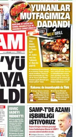 Κεντρικό θέμα της εφημερίδας, είναι εάν το κοκορέτσι και το ιμάμ μπαϊλντί είναι τουρκικά ή ελληνικά πιάτα. Φιλοξενεί μάλιστα και αναλυτές που επιχειρηματολογούν υπέρ της τουρκικής προέλευσης των δύο πιάτων λέγοντας: «Οι Ελληνες διεκδικούν την κουζίνα μας», όπως ανέφερε ο ανταποκριτής του ΣΚΑΪ στην Κωνσταντινούπολη, Μανώλης Κωστίδης.