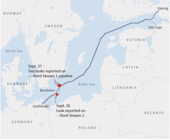 Η Ναυτιλιακή Αρχή της Σουηδίας εξέδωσε προειδοποίηση για δύο διαρροές στον αγωγό Nord Stream 1, την επομένη που εντοπίστηκε διαρροή στον κοντινό αγωγό «Nord Stream 2» που ώθησε τη Δανία να περιορίσει τη ναυσιπλοΐα και να επιβάλει μια μικρή ζώνη απαγόρευσης πτήσεων, πάνω από τη συγκεκριμένη περιοχή. «Σήμερα αντιμετωπίσαμε μια πράξη δολιοφθοράς, δεν γνωρίζουμε όλες τις λεπτομέρειες του τι συνέβη, αλλά βλέπουμε ξεκάθαρα ότι είναι μια πράξη δολιοφθοράς, που σχετίζεται με το επόμενο βήμα κλιμάκωσης της κατάστασης στην Ουκρανία», δήλωσε ο πρωθυπουργός της Πολωνίας, Ματέους Μοραβιέτσκι κατά τη διάρκεια των εγκαινίων ενός νέου αγωγού μεταξύ Νορβηγίας και Πολωνίας.