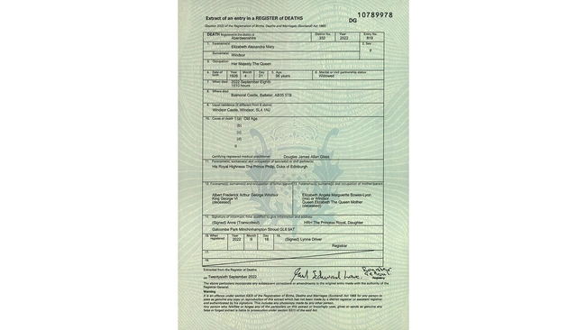 Αυτή που έκανε γνωστό τον θάνατό - σύμφωνα με την ληξιαρχική πράξη θανάτου - ήταν η κόρη της πριγκίπισσα Αννα. Ο γιατρός που πιστοποίησε τον θάνατό της ήταν ο Douglas James Allan Glass, ο οποίος είναι γενικός ιατρός από το χωριό Χάιλαντς Αμπόιν, περίπου 20 μίλια από το Μπαλμόραλ. Να σημειωθεί ότι τα τελευταία 24ωρα είχαν υπάρξει αντιδράσεις για τον λόγο ότι η αρμόδια ληξιαρχική υπηρεσία (Εθνικών Μητρώων της Σκωτίας - NRS) δεν έδινε ως όφειλε από το νόμο το έγγραφο στη δημοσιότητα. Ειδικότερα, ένα τμήμα της κυβέρνησης της Σκωτίας κατηγορήθηκε ότι εμποδίζει τις νόμιμες προσπάθειες απόκτησης αντιγράφου του πιστοποιητικού θανάτου της βασίλισσας, παρά το γεγονός ότι πρόκειται για δημόσιο αρχείο.