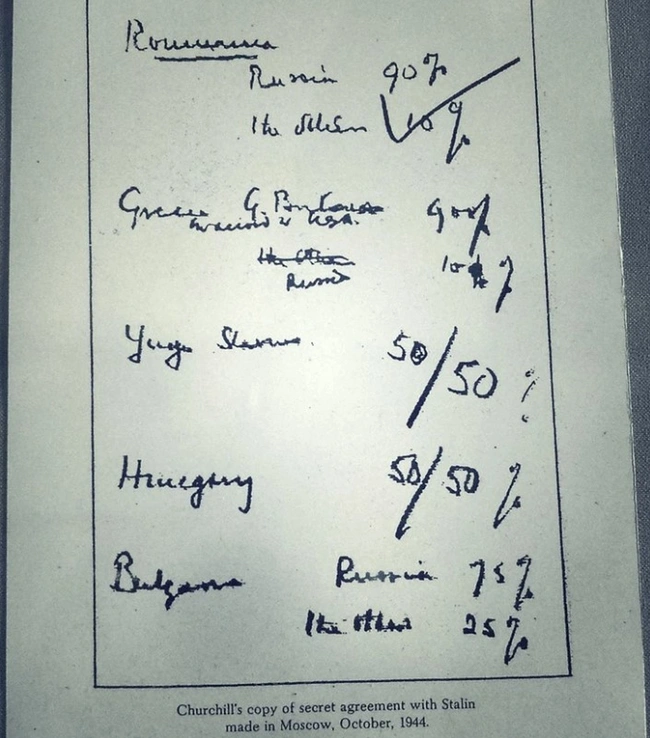 «Έκρινα κατάλληλη τη στιγμή για να δράσω. Εδήλωσα: ”Ας ρυθμίσωμε τις υποθέσεις μας στα Βαλκάνια. Τα στρατεύματά σας ευρίσκονται στη Ρουμανία και στη Βουλγαρία. Έχομε συμφέροντα, αποστολές, πράκτορες σ’ αυτές τις χώρες. Ας αποφύγω με την σύγκρουση για ζητήματα ασήμαντα» είπε ο Τσώρτσιλ στον Στάλιν, όπως ο ίδιος ο τότε βρετανός πρωθυπουργός έγραψε στα απομνημονεύματα του και πρόσθεσε: «Σχετικώς προς την Μεγάλη Βρετανία και την Ρωσία τι θα ελέγατε για μια υπεροχή κατά 90% υπέρ υμών στην Ρουμανία, υπεροχή κατά 90% υπέρ ημών στην Ελλάδα και ίση συμμετοχή κατά 50% στην Γιουγκοσλαβία ;”. Ενώ μετεφράζοντο οι λόγοι μου, έγραψα σε μισό φύλλο χαρτιού: