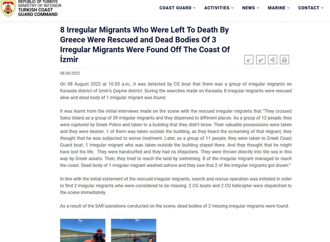 Είναι χαρακτηριστικό πως μόνο κατά το μήνα Σεπτέμβριο η τουρκική ακτοφυλακή έχει αναρτήσει στην επίσημη ιστοσελίδα της 78 υποτιθέμενα push backs από το Λιμενικό Σώμα - Ελληνική Ακτοφυλακή, που αφορούσαν σε συνολικά 2.400 μετανάστες και πρόσφυγες! Σύμφωνα με το τουρκικό αφήγημα, τα άτομα αυτά διασώθηκαν στη συνέχεια λόγω της έγκαιρης παρέμβασης των τουρκικών αρχών, οι οποίες όμως ήταν αυτές, που στην πραγματικότητα τους έσπρωξαν με κάθε τρόπο, ακόμα και χρήση βίας, να περάσουν στα ελληνικά νησιά.