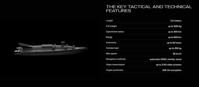 Σύμφωνα με τα τεχνικά στοιχεία που έχουν αποδεσμεύσει οι Ουκρανοί, η ακτίνα δράσης του σκάφους ξεπερνά τα 400 χλμ ενώ μέσω δορυφορικής πλοήγησης από ένα επίγειο «αυτόνομο» κέντρο ελέγχου κατευθύνεται προς τους στόχους, που θα πλήξει ύστερα από σύγκρουση μαζί τους. Την κίνηση και την επιτάχυνση του έως τα 80 χλμ την ώρα εξασφαλίζει 3κύλινδρος κινητήρας με τη φονική τορπίλη επιφανείας να εκρήγνυται όταν οι αισθητήρες του έρθουν σε επαφή με τους εχθρικούς ναυτικούς στόχους.
