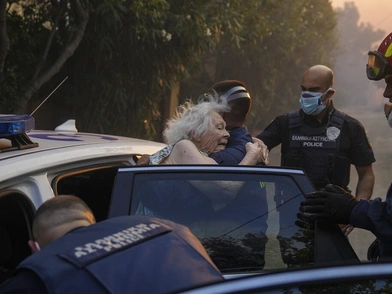 Στη φωτογραφία που τράβηξε ο Θανάσης Σταυράκης, πυροσβέστες και αστυνομικοί απομακρύνουν μία ηλικιωμένη γυναίκα από το σπίτι της στην Πεντέλη, μετά τη μεγάλη δασική πυρκαγιά που ξέσπασε βορειοανατολικά της Αθήνας, η οποία ενισχύθηκε από ισχυρούς ανέμους.