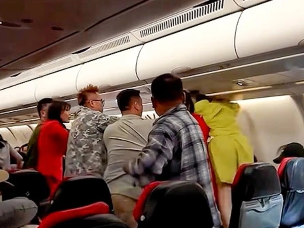 Απελπισμένα τα μέλη του πληρώματος καμπίνας, φαίνονται στο βίντεο να παλεύουν με όσους εμπλέκονται στη συμπλοκή, ενώ τα φώτα έκτακτης ανάγκης αναβοσβήνουν.