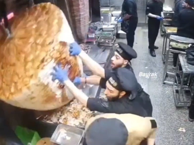 Κάτω από το βάρος όμως, η ψησταριά καταρρέει, και παρά λίγο παρασύρει τον ψήστη στο κάτω μέρος του κλιπ, που σπρώχνεται στην άκρη από συνάδελφό του.