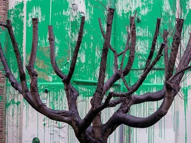 Ο Banksy είχε χρησιμοποιήσει πράσινη μπογιά στον πελώριο τοίχο ενός κτιρίου για να «ντύσει» με φύλλωμα ένα πραγματικό δέντρο, που είχε κλαδευτεί και στέκεται λίγα μέτρα μπροστά από την εικαστική παρέμβαση.