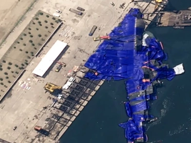 Δορυφορικές εικόνες δείχνουν το πολεμικό πλοίο – καλυμμένο με μπλε μουσαμάδες – να έχει γείρει στο πλάι, με την πρύμνη στραμμένη προς το λιμάνι και την πλώρη να παραμένει στη ράμπα, σύμφωνα το αμερικανικό Κέντρο Στρατηγικών και Διεθνών Σπουδών (CSIS).