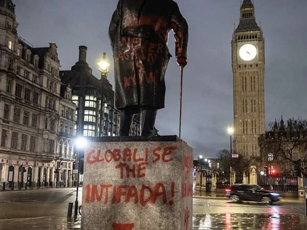 Σύμφωνα με το ΑΠΕ-ΜΠΕ, εικόνες που μεταδόθηκαν από μέσα ενημέρωσης έδειχναν γραμμένο «Σιωνιστής εγκληματίας πολέμου» στη βάση του αγάλματος, ενώ το ίδιο το γλυπτό με τη φιγούρα του Τσόρτσιλ ήταν καλυμμένο με κόκκινη μπογιά και είχαν γραφτεί συνθήματα μεταξύ των οποίων «Λευτεριά στην Παλαιστίνη» και «Σταματήστε την Γενοκτονία».