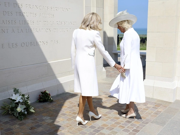 Η βασίλισσα Καμίλα και η Μπριζίτ Μακρόν, ντυμένες και οι δύο στα λευκά, αφού τοποθέτησαν τα λουλούδια στο μνημείο, απομακρύνθηκαν, με την πρώτη κυρία της Γαλλίας να απλώνει το χέρι της στη Βασίλισσα, αλλά η Καμίλα φάνηκε κάπως απρόθυμη να «ανταποδώσει».
