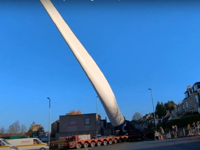 Κόβουν την ανάσα οι εικόνες από ένα φτερό ανεμογεννήτριας που φαίνεται να μεταφέρεται μέσα από την πόλη του Χάγουικ στα σύνορα της Σκωτίας, με το πανύψηλο εξάρτημα ύψους 65 μέτρων να στέκει σαν «πύργος του Άιφελ» πάνω από την κωμόπολη με τα χαμηλά σπίτια.