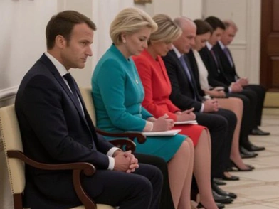 Η εικόνα, που έχει γίνει viral, φαίνεται να απεικονίζει αρχηγούς κρατών σε σειρά αναμονής σε διάδρομο, δίνοντας την εντύπωση ότι περιμένουν να δουν τον Τραμπ. Πέρα όμως από την αφύσικη γεωμετρία στα πρόσωπα και τις εκφράσεις, αρκετά ανατομικά λάθη (όπως χέρια και μάτια) υποδεικνύουν ότι πρόκειται για κατασκεύασμα AI.