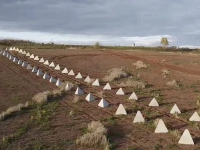 Οι εικόνες, από το σημείο της κατασκευής, δείχνουν γερανούς να μεταφέρουν πυραμιδοειδής κατασκευές, που θυμίζουν δόντια, και να σκάβονται λαγούμια στο έδαφος.