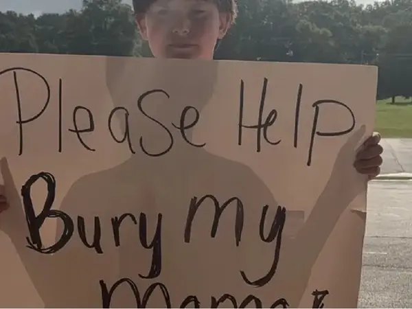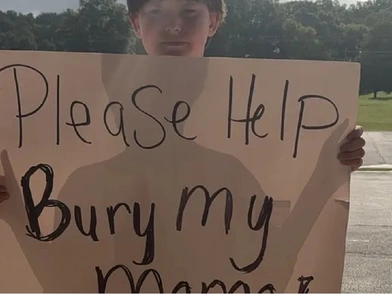 «Παρακαλώ βοηθήστε να θάψουμε τη μαμά μου», γράφει η πινακίδα. Η μητέρα του, Σάνον, υπέστη καρδιακή ανακοπή και πέθανε στις 16 Ιουλίου, μετά από αρκετές ημέρες σε τεχνητή υποστήριξη στο νοσοκομείο.