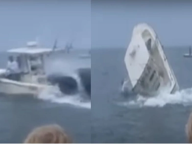 Ένα ευτυχώς αναίμακτο ατύχημα συνέβη στα ανοιχτά των ΗΠΑ, όταν μία τεράστια φάλαινα έπεσε με το ρύγχος της επάνω σε ένα καΐκι, γυρίζοντας στο πλάι το πλεούμενο και εκσφενδονίζοντας τους επιβάτες στη θάλασσα.