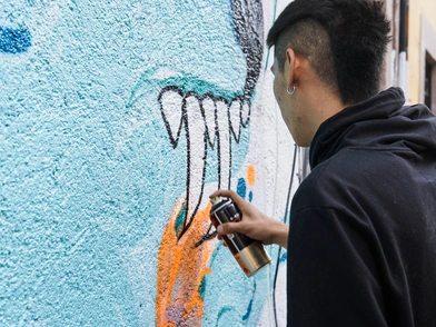 Ένας πιτσιρικάς με μαύρα ρούχα και full face, το οποίο κάλυπτε το μισό του πρόσωπο, ζωγράφιζε ένα γκραφίτι, ενώ απέναντί του στο πεζοδρόμιο, κάθονταν τρία ακόμα παιδιά που τον χάζευαν, πίνοντας μπίρες. Πλησίασα για να αντικρίσω από κοντινή απόσταση τη δημιουργία του.