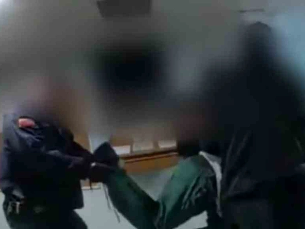 Ενώ ο κρατούμενος είναι καθιστός, με τα χέρια δεμένα, εμφανώς τραυματισμένος, φύλακας φορά πλαστικό γάντι, τον πιάνει από τον λαιμό και με τη βοήθεια συναδέλφου του τον στήνει στον τοίχο.