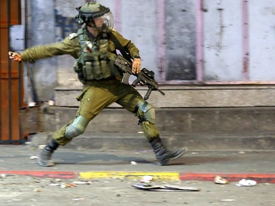 Οι στρατιώτες φαίνονται να ανοίγουν πυρ στον αέρα μέσα από τον προσφυγικό καταυλισμό της Τζενίν και η ομάδα φεύγει πίσω στα αυτοκίνητά της.
