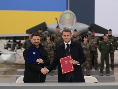 Ο Εμανουέλ Μακρόν υποδέχθηκε τον πρόεδρο της Ουκρανίας Βολοντίμιρ Ζελένσκι στην αεροπορική βάση του Βιλακουμπλέ, κοντά στο Παρίσι, πριν από την υπογραφή εξοπλιστικής συμφωνίας που χαρακτηρίζεται «ιστορική» από τον ουκρανό πρόεδρο για την ενίσχυση της πολεμικής αεροπορίας και της αντιαεροπορικής άμυνας της Ουκρανίας.