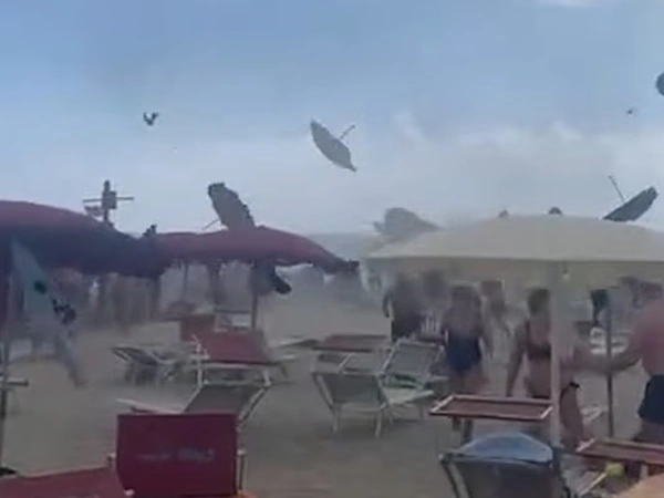 Σοκαριστικά πλάνα κατέγραψαν τη στιγμή που οι τουρίστες αναγκάστηκαν να εγκαταλείψουν μια παραλία στην Ιταλία, μετά από ένα χτύπημα ανεμοστρόβιλου.
