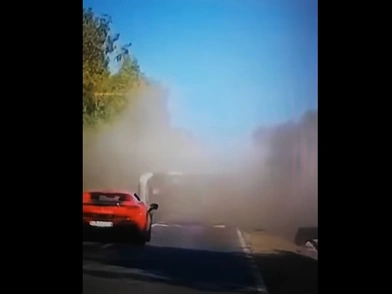 Στη συνέχεια, μια κόκκινη Ferrari επιταχύνει παράλληλα με την κινούμενη Lamborghini και τα δύο οχήματα ακουμπούν και χτυπούν το τροχόσπιτο. Η Ferrari βρέθηκε πίσω από το αναποδογυρισμένο φορτηγάκι και δεν φαίνεται στο βίντεο, αλλά σύμφωνα με τα τοπικά μέσα ενημέρωσης έπιασε φωτιά, εγκλωβίζοντας το άτυχο ζευγάρι μέσα σε αυτό.
