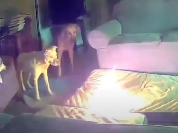 Το βίντεο δείχνει τον σκύλο, ο οποίος είναι ξαπλωμένος σε ένα στρώμα, να πετάγεται μακριά από την συσκευή, τη στιγμή που άρχισαν να βγαίνουν σπινθήρες. Η φωτιά ξέσπασε γρήγορα και εξαπλώθηκε με ταχύτητα.