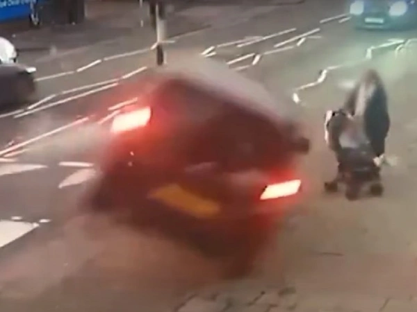 Η μητέρα φαίνεται να περπατάει σπρώχνοντας το καροτσάκι του μωρού της, όταν ξαφνικά ένα διερχόμενο αυτοκίνητο βγαίνει εκτός της πορείας του και πέφτει πάνω σε φωτεινό σηματοδότη, προτού αναποδογυρίσει στο πεζοδρόμιο.