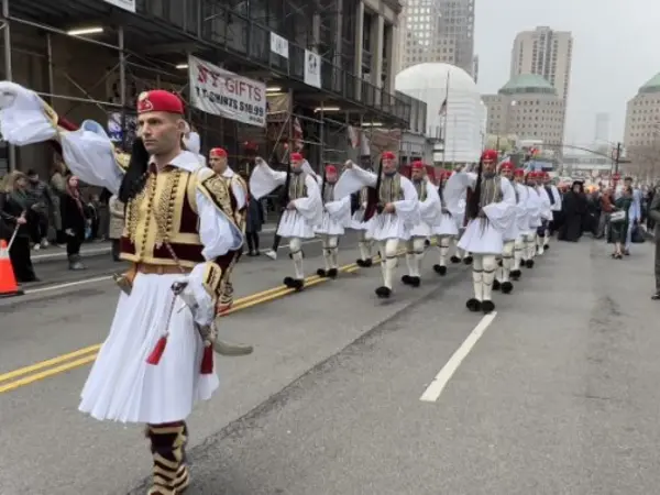Υπό δυνατή βροχή πραγματοποιούνται οι εκδηλώσεις για την 25η Μαρτίου στη Νέα Υόρκη. Οι εύζωνες της Προεδρικής Φρουράς παρέλασαν από τον Ιερό Ναό Αγίου Νικολάου στο σημείο των Δίδυμων Πύργων, έως και το εμβληματικό Πάρκο ενώ έγινε η έπαρση της ελληνικής σημαίας στο Μπόουλινγκ Γκριν.