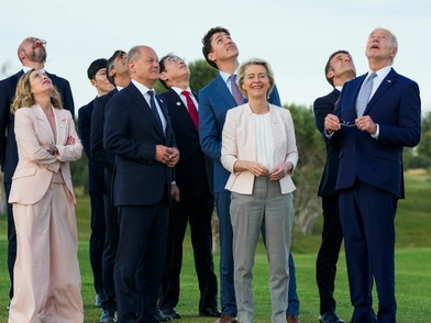 Ελάχιστα δευτερόλεπτα μετά την πτώση του αλεξιπτωτιστή με τη σημαία της Συνόδου Κορυφής, όλοι οι παρευρισκόμενοι ηγέτες, πλην του Γερμανού Καγκελαρίου, Όλαφ Σολτς, στρέφουν το κεφάλι τους προς την εν λόγω ομάδα.